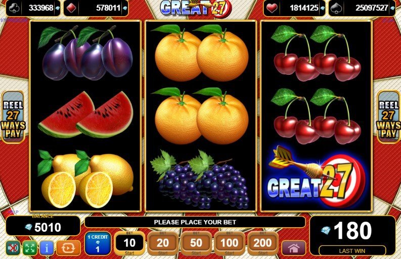 EGT softver provajder je dobro poznat po velikoj ponudi klasičnih video slotova. Raspored 3×3 u Great 27 čini ovaj slot više autentičnim i daje igračima osećaj kao da su zaista u nekom od kazina Las Vegasa dok igraju ovu igru. Kao što ime govori, ovaj slot ima 27 platnih linija koje su raspoređene u tri kolone, a igrači dolaze do dobitka kada su simboli poređani horizontalno.