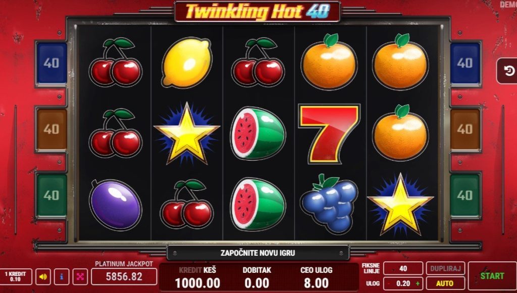 Kada su u pitanju simboli, Twinkling Hot 40 slot ima osnovne simbole koje čini voće – trešnje, limun, narandže, šljive, grejpfrut i lubenica. Tu je i srećna crvena sedmica, dok je zlatna zvezda skater simbol. Ovaj slot nema wild simbol, a njegov klasičan dizajn daje pravi retro osećaj koji će odgovarati ljubiteljima ovakvih slotova.